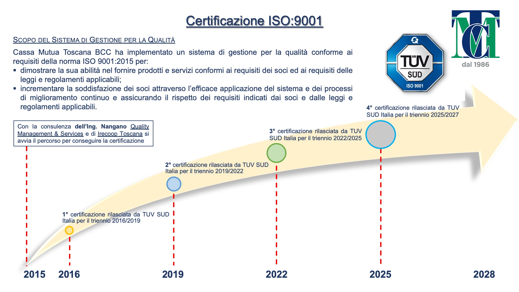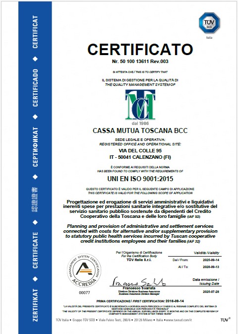 Cassa Mutua Toscana, pur non avendo obblighi normativi, ha richiesto e ottenuto la certificazione di qualità ISO 9001 versione 2015 dall’ente certificatore TUV Italia.